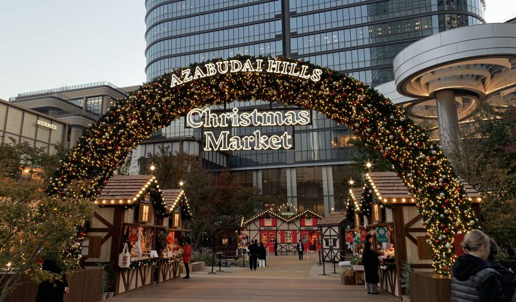 The venue, the central square of Azabudai Hills, is draped with golden lights and a truckload of decorations. If you feel chilly outside, try one of the limited-edition dishes at a nearby restaurant.