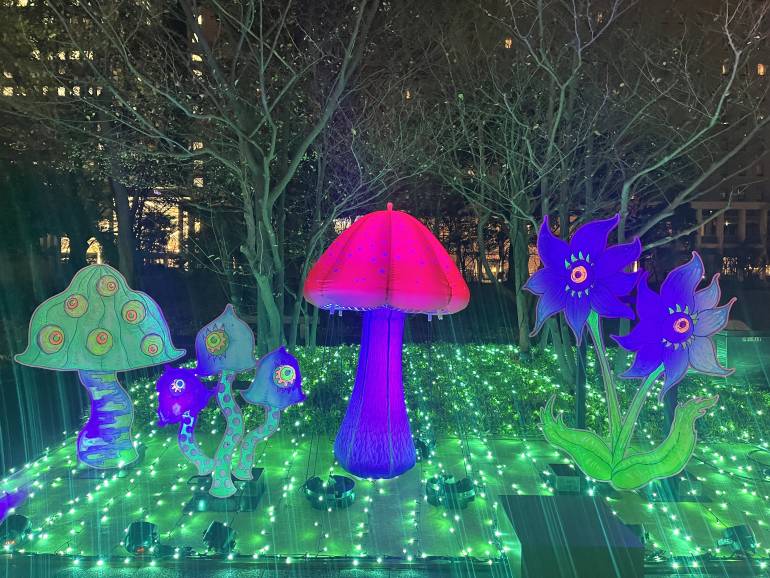While many illuminations go for seasonal themes — think snowflakes and cute woodland creatures — Light Walk Odaiba leans into fantasy. There are otherworldly, glowing mushrooms, flowers with faces, and patterned light domes you can step into. There is also one designated photo spot, featuring two plush chairs against a radiant background of yet more LEDs.