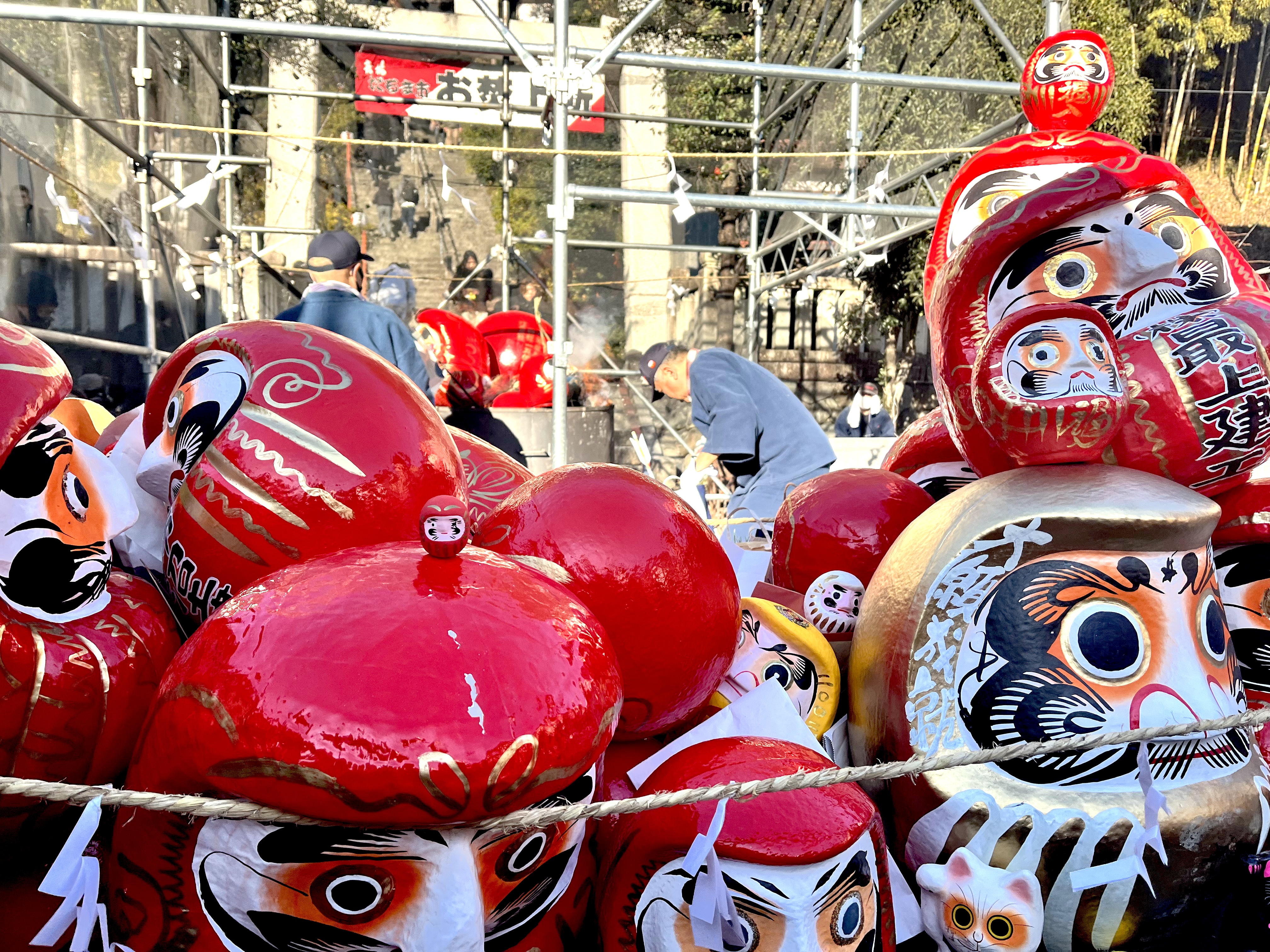 The main road is where the majority of the stalls selling Daruma dolls are located. These come in a variety of sizes and colors, in addition to riffs on the original that resemble cats, birds, horses and more.