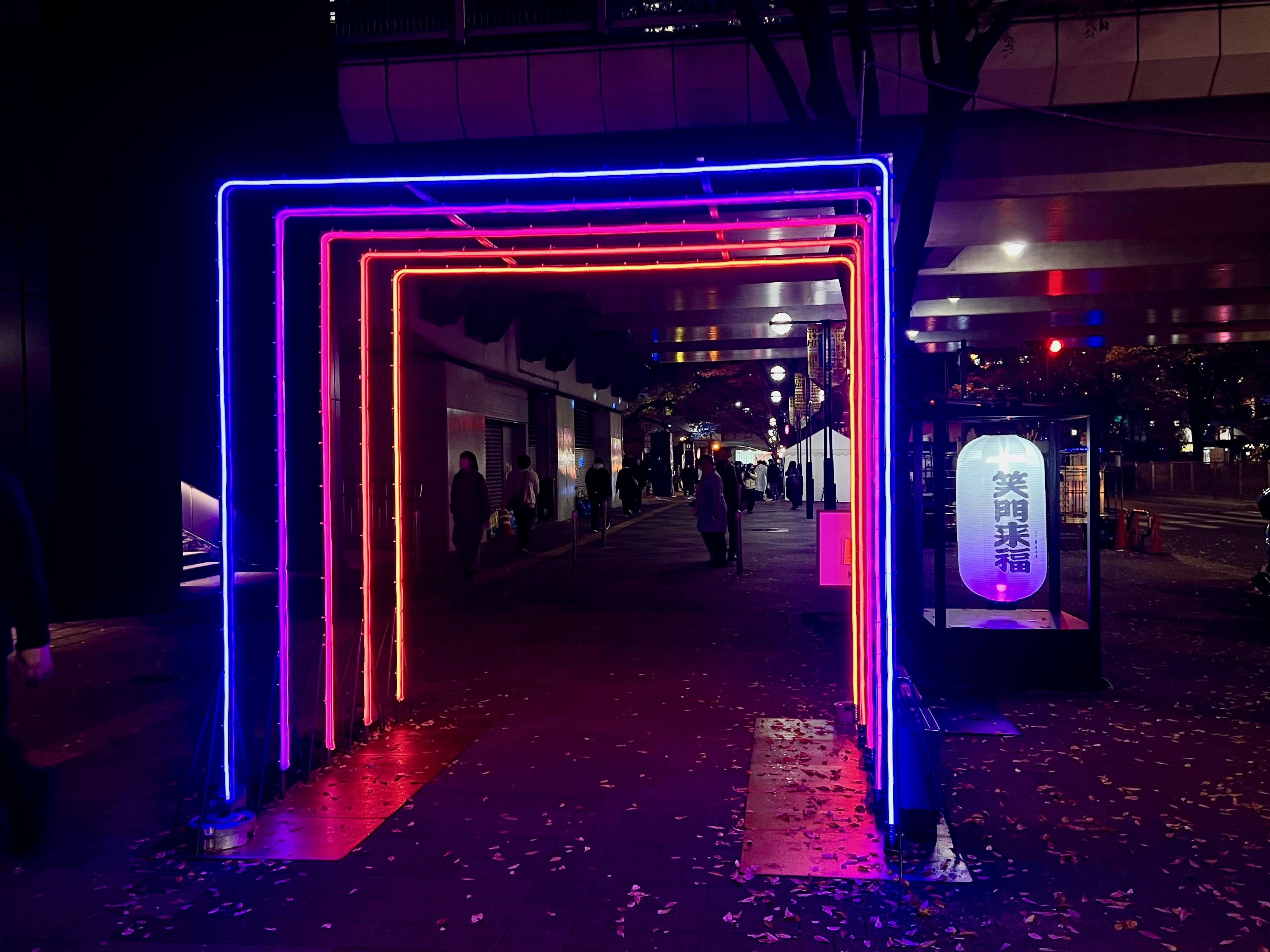 Along the route, you’ll find an AI-powered screen that warps your reflection like a funhouse mirror, a glowing torii, Edo-style lanterns reimagined in neon, and a pair of illuminated trees that “talk” to each other through light and sound.