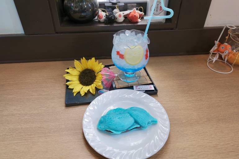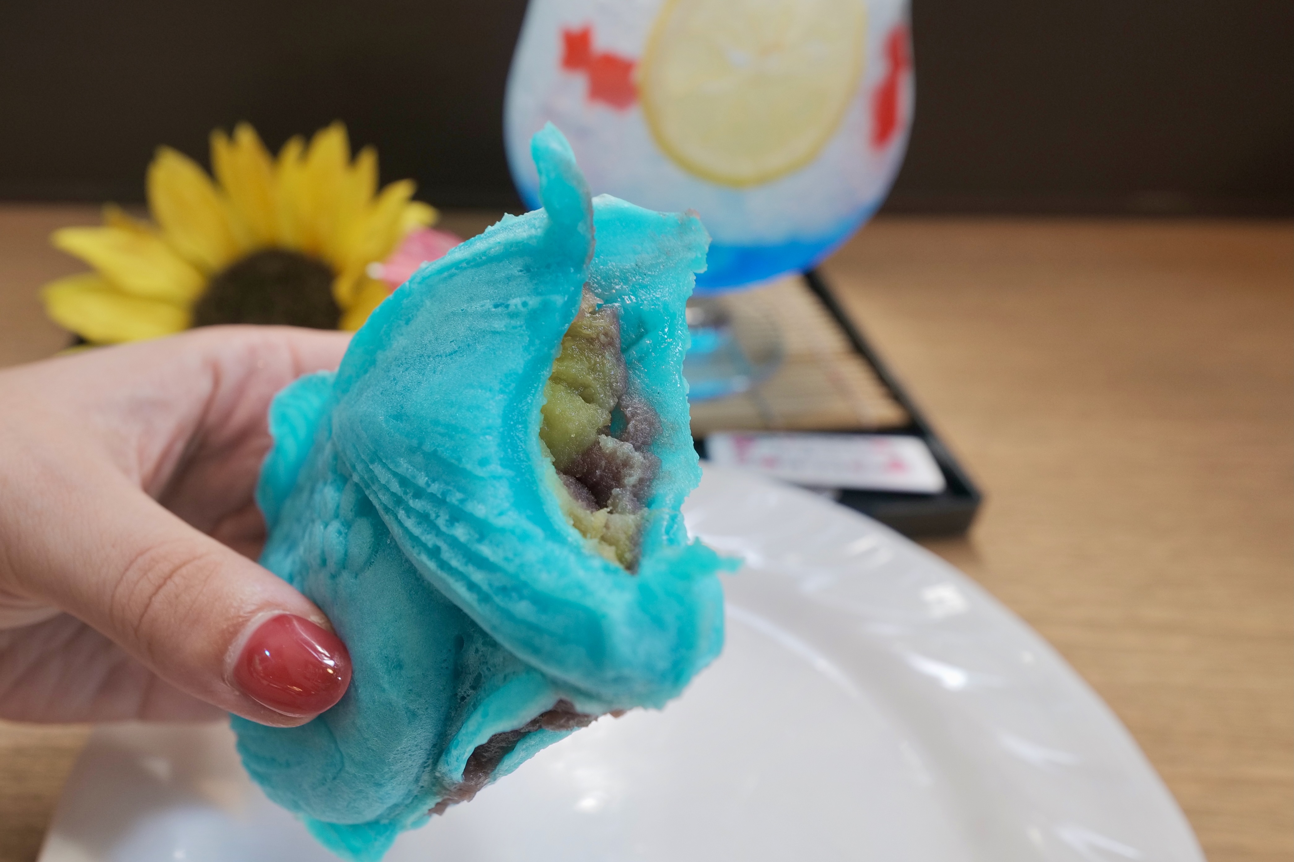 On our visit, we tried the soda and taiyaki sweet — both in the Blue Hawaiian flavor. This writer had personally never seen such a bright blue taiyaki before.